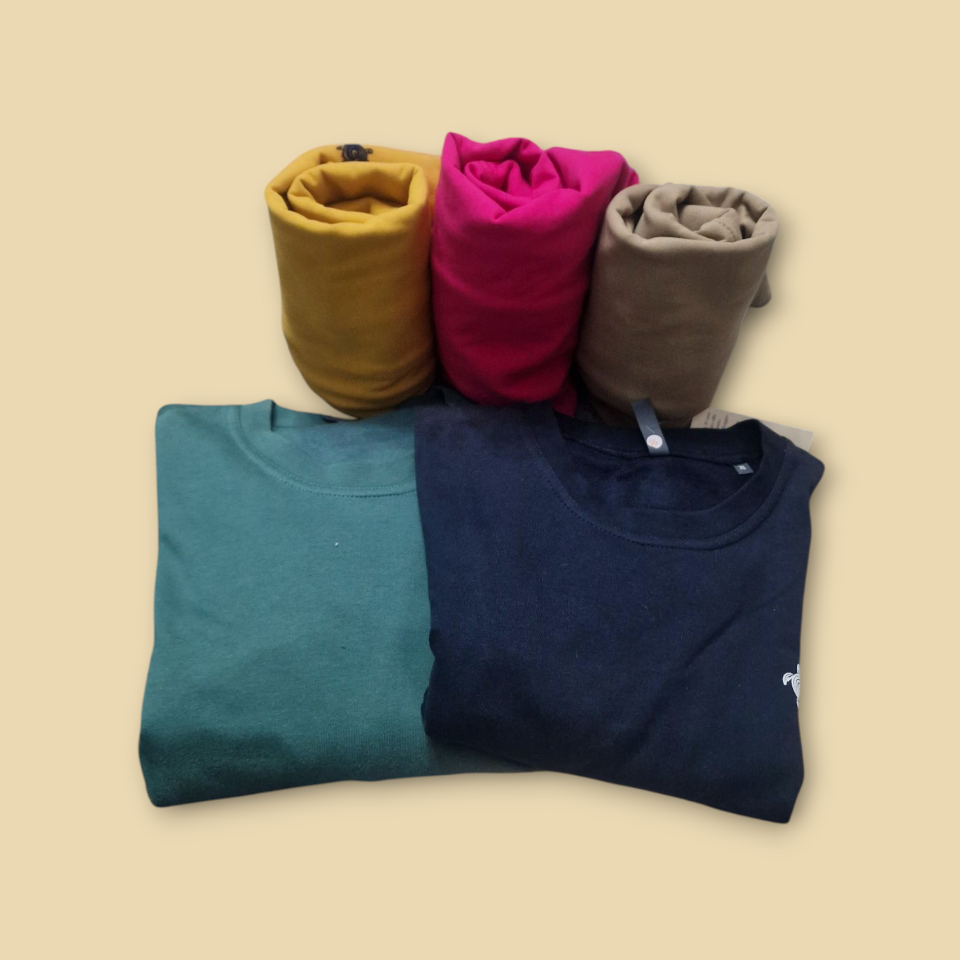Realizzata in 80% cotone pettinato e 20% poliestere, offre una morbidezza naturale e una resistenza che accompagna il tempo. Il tessuto leggero ma compatto abbraccia il corpo con una vestibilità regolare e confortevole, mentre il collo, i polsini e il fondo capo a costine definiscono linee pulite e senza tempo.